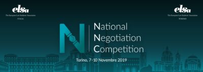 ELSA Italia ed ELSA Torino sono orgogliose di presentare la V edizione della National Negotiation Competition, simulazione di negoziazione nella quale squadre di studenti e neolaureati si sfidano su un caso pratico al fine di addivenire alla conclusione di un accordo dinanzi al Collegio Giudicante, composto da docenti universitari e professionisti del settore.